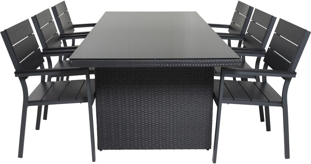 Matgrupp med ett bord och 6 stycken stolar. Stolarna är tillverkade av Aluminium/Polywood och bordet är tillverkat av Glas/Aluminium. Stolarna är stapelbara.