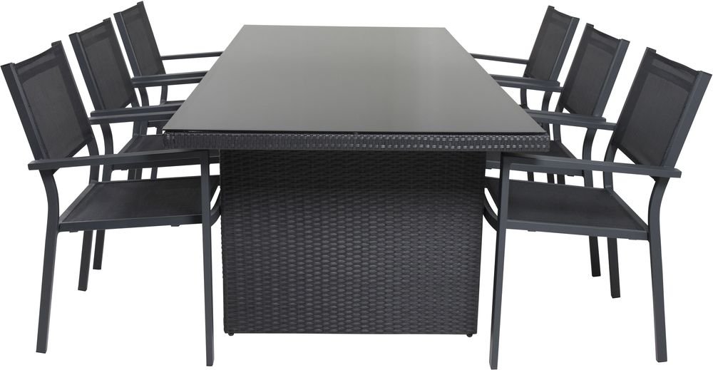 Matgrupp med ett bord och 6 stycken stolar. Stolarna är tillverkade av Aluminium/Textilene och bordet är tillverkat av Glas/Aluminium. Stolarna är stapelbara.