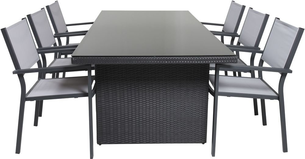 Matgrupp med ett bord och 6 stycken stolar. Stolarna är tillverkade av Aluminium/Textilene och bordet är tillverkat av Glas/Aluminium. Stolarna är stapelbara.