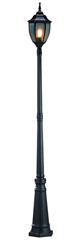 Klassisk stolplampa för utomhusbelysningen. Tillverkad i svartlackerad metall och klarglas. IP-klassen är IP23 avsedd för fast installation. Stor lamphållare (E27). Max 75W glödljus eller motsvarande styrka i halogen, lågenergi eller LED. Markjärn för ingjutning medföljer.