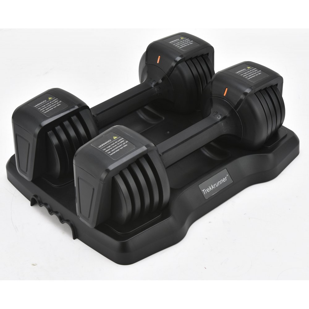 Justerbara hantlar med en maxvikt på 6,7 kg per hantel där vikten justeras genom avtagbara plattor, vilket gör det möjligt att anpassa belastningen i flera steg beroende på träningsmoment; konstruktionen är kompakt för enkel förvaring och handtagen är utformade för stabilt grepp vid övningar för armar, axlar och överkropp.