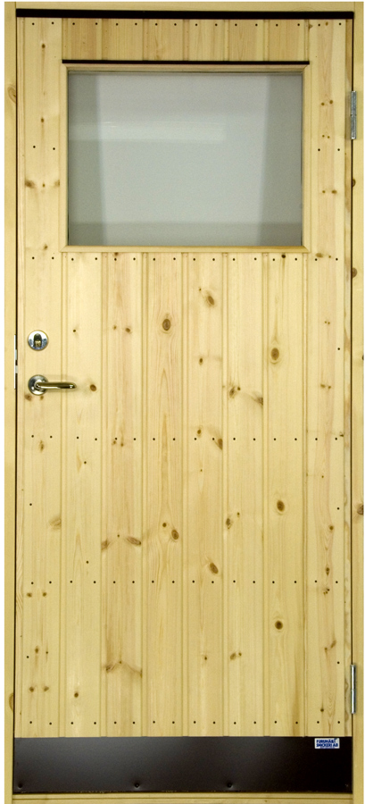 Förrådsdörr med glas (inklusive karm och låskista) från Furuhälls Snickeri avsedd för förråd/lokal som ej uppvärms till mer än +10°C. Vid högre temperatur kan dörrens form påverkas.