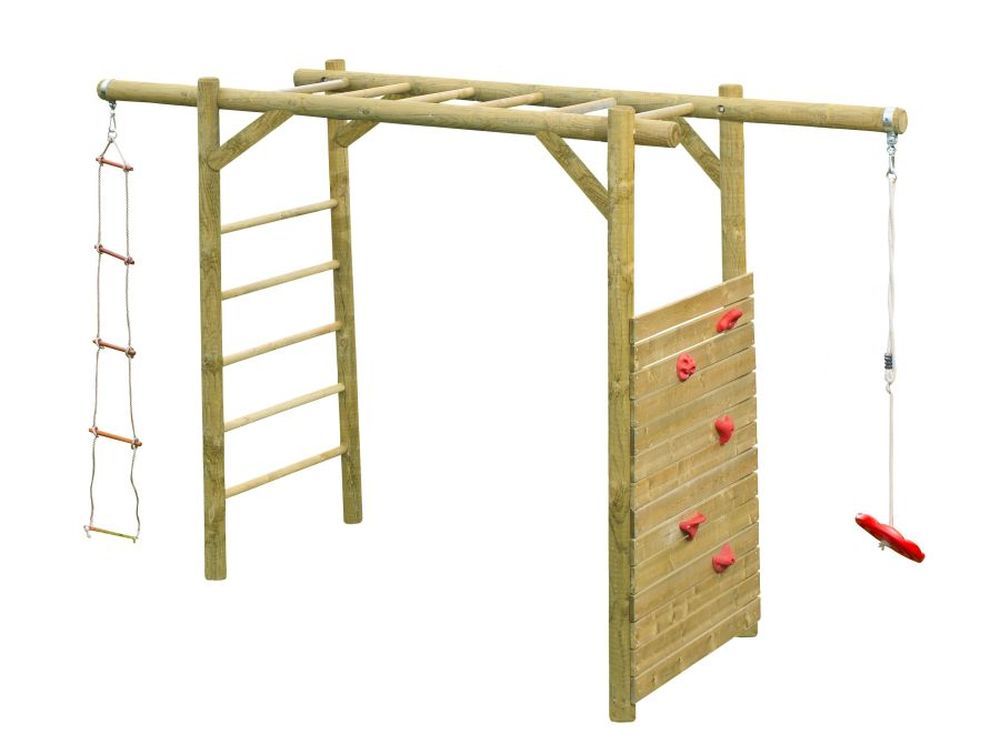 En klätterställning lockar de flesta barn till utomhuslek. Här kan de klättra, hänga och träna fysisk aktivitet i friska luften, vilket gynnar deras hälsa och välmående, samt utvecklar grovmotoriken. Klätterställningen har en snygg enkel design i stabilt tryckimpregnerat trä för att lätt passa in i din trädgård. (TÜV och FSC certifierad).