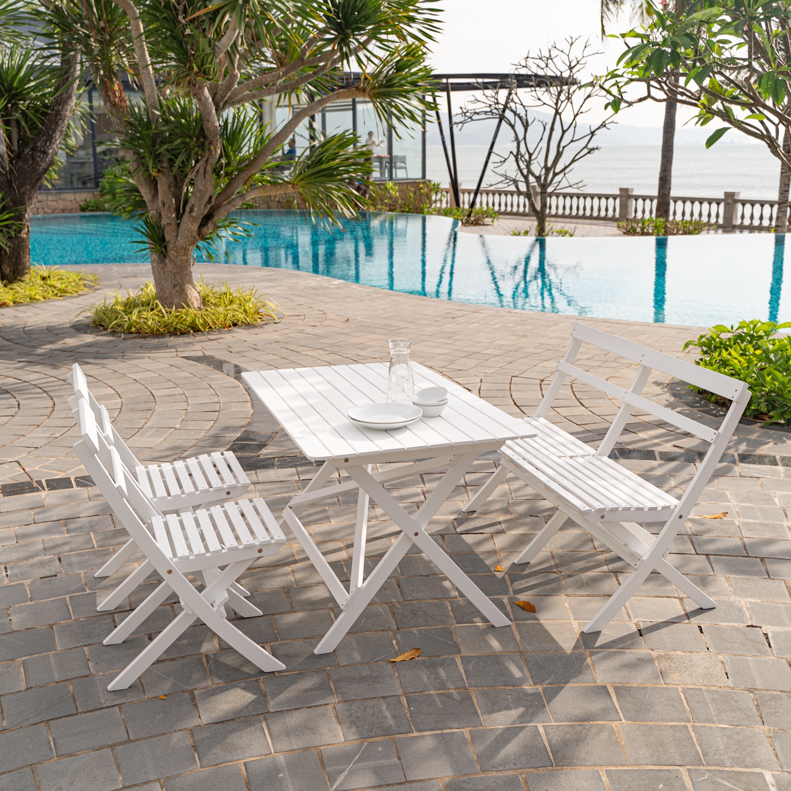 Klassisk matgrupp i vitlaserat trä för trädgården. Settet är komplett med soffa, 2 stolar och bord. En utegrupp som smälter bra in i de flesta trädgårdar.