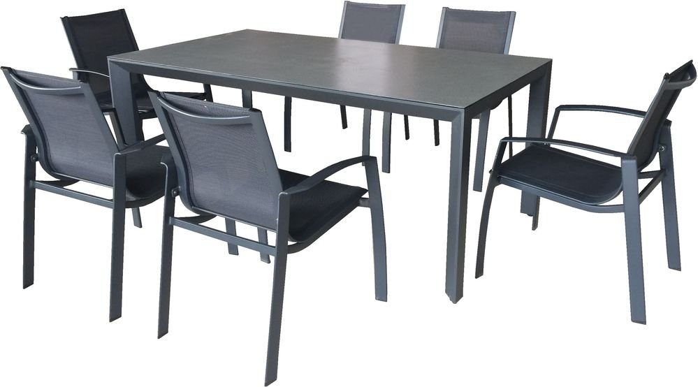 Modern matgrupp med stomme i antracitfärgad väderbeständig aluminium och svart textilen i stolarna. Stolarna är stapelbara. Bordsskivan är av härdat glas.