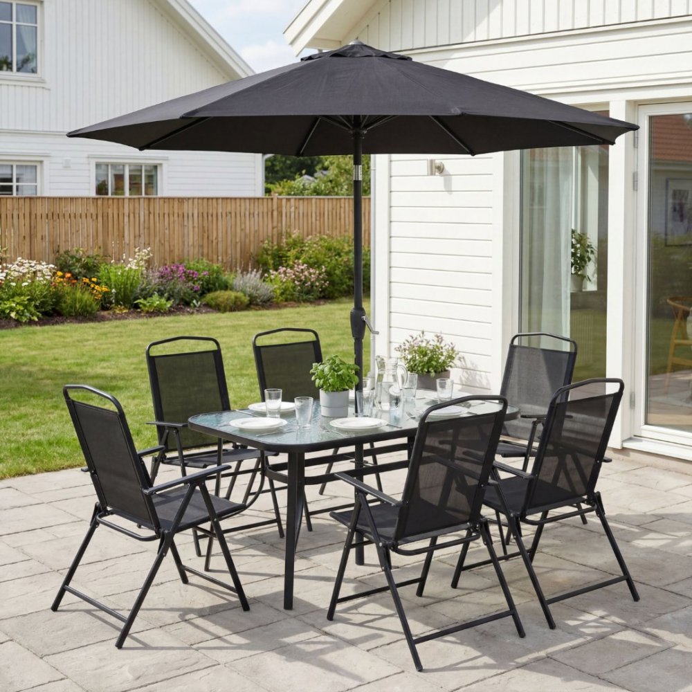 Växjö utegrupp är en komplett matgrupp med sex stycken fällbara postionsstolar i svart metallstomme med textilene, matchande parasoll och ett rektangulärt bord med "vågig" glasskiva. Utegruppen är nätt vllket gör den lättplacerad på altanen eller uteplatsen. Prasollen väcklas upp och ner enkelt med vevhandtag, parsollen går även att vinkla.