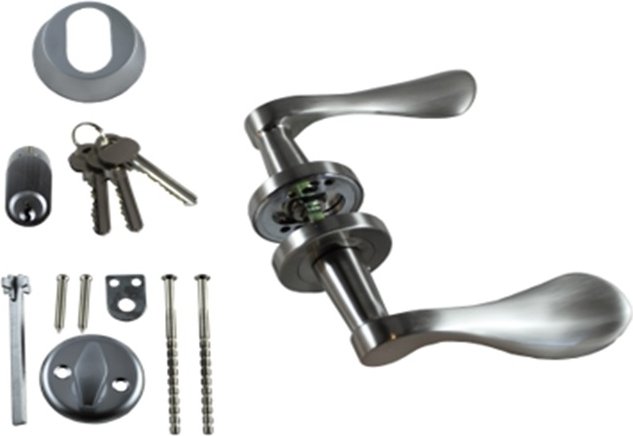 Komplett tryckespaket - satinkromat. Passar alla våra ytterdörrar. Observera dock att detta tryckespaket inte passar till låskistan ASSA 2002 (som finns som tillval på några av våra dörrar).