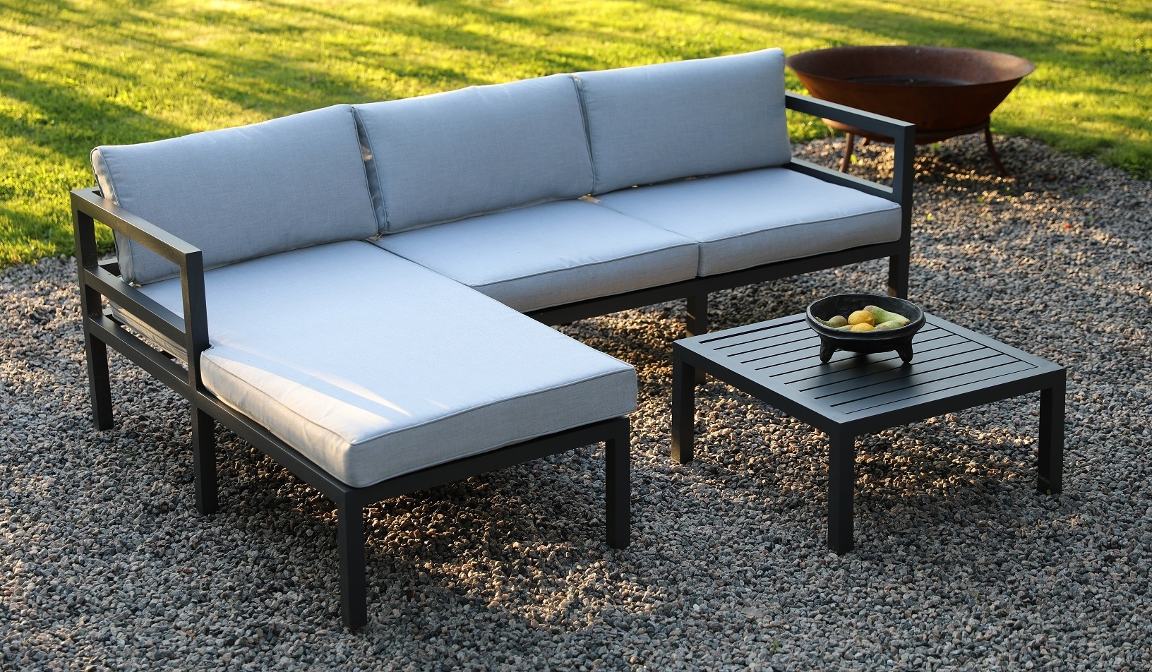 Kungsnäs soffgrupp med stomme i mörkgrå aluminium samt grå sitt- och ryggdynor. Setet innehåller även ett matchande soffbord.