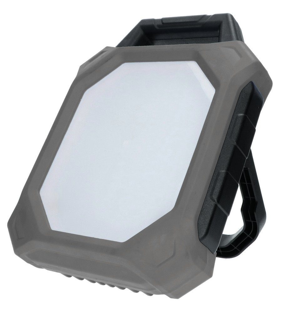 Denna laddningsbara arbetslampa med power bank-funktion är lätt att bära eftersom den kan användas trådlöst. Arbetslampan är utrustad med ett uttag för att ansluta den medföljande (H05RN-F) kabeln (1,5 meter) för laddning. Ett fulladdat batteri har en användningstid på cirka 3 timmar och laddningen av batteriet tar cirka 4 timmar. Denna lampa har en ljusstyrka på 2100Lm, en vit färgtemperatur på dagsljus och är miljövänlig på grund av den låga energiförbrukningen på 30W och dess långa livslängd på 500 laddningscykler. Denna arbetslampa är damm- och sprutvattentät (IP54) och slagtålig (IK08).