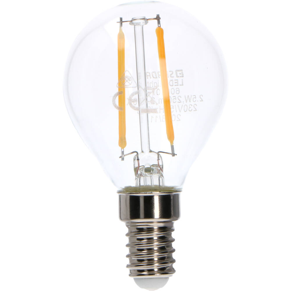 LED lampa med E14 sockel, en ljusstyrka på 250 Lm med en energiförbrukning på bara 2,5W och en strålvinkel på 360 grader. Denna lampa är tillverkad i glas med en högkvalitativ finish och har en varm vit färgtemperatur på 2700K. Miljövänligt på grund av den låga energiförbrukningen och livslängden på 15 000 timmar. Denna modell är sfärisk och har en diameter på 45 mm (G45). Denna lampa är inte dimbar.