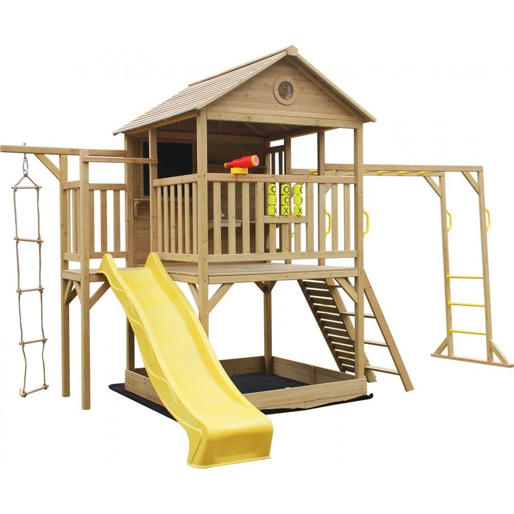 Kojan i två våningar är navet för fantasifulla lekar. Nedervåningen rymmer en rymlig sandlåda, komplett med underpapp för enkel rengöring och underhåll. Övervåningen är en plattform med ett tak för skydd mot väder och vind. Med 110 cm från marken till plattformen och en taknock på 285 cm ger den tillräckligt med utrymme för barn att leka och utforska.