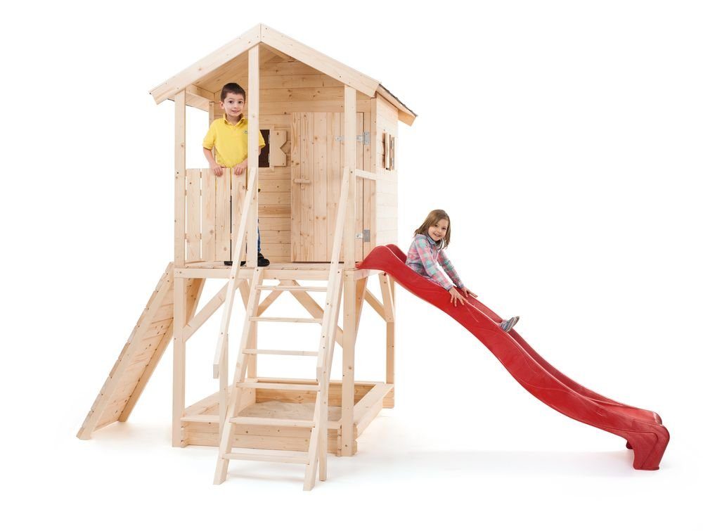 I paketet ingår en Terrass utbyggnad, styltor som lyfter upp lekstugan 112cm, en stegtrappa, en rutschkana, en praktisk klättervägg och en sandlåda.