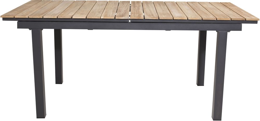 Matbord med underrede i svart metall och bordsskiva i teak. Förlängningsbart.