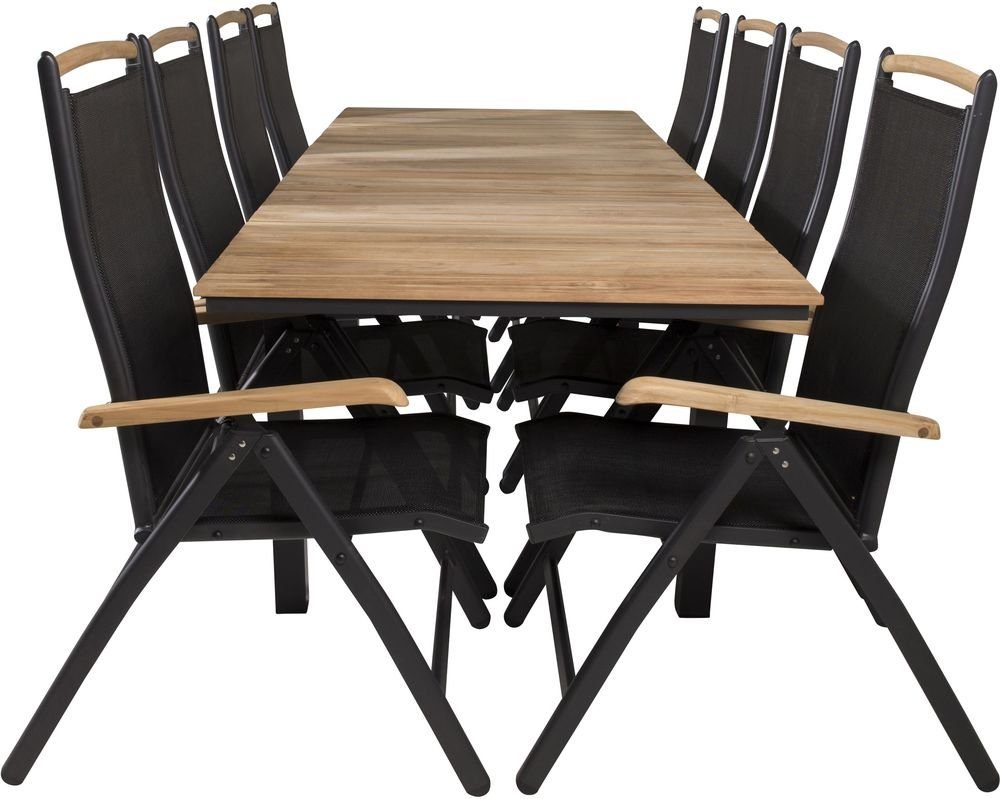 Matgrupp med ett bord och 8 stycken stolar. Stolarna är tillverkade av Aluminium/Textilene/Teak och bordet är tillverkat av Teak/Aluminium.