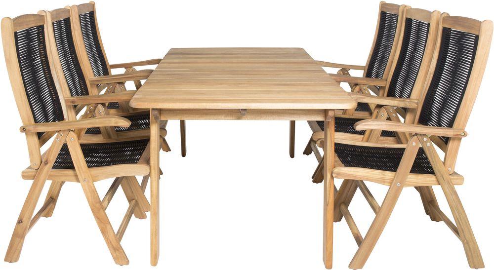 Matgrupp med ett bord och 6 stycken stolar. Stolarna är tillverkade av Akacia/Rep och bordet är tillverkat av Akacia.