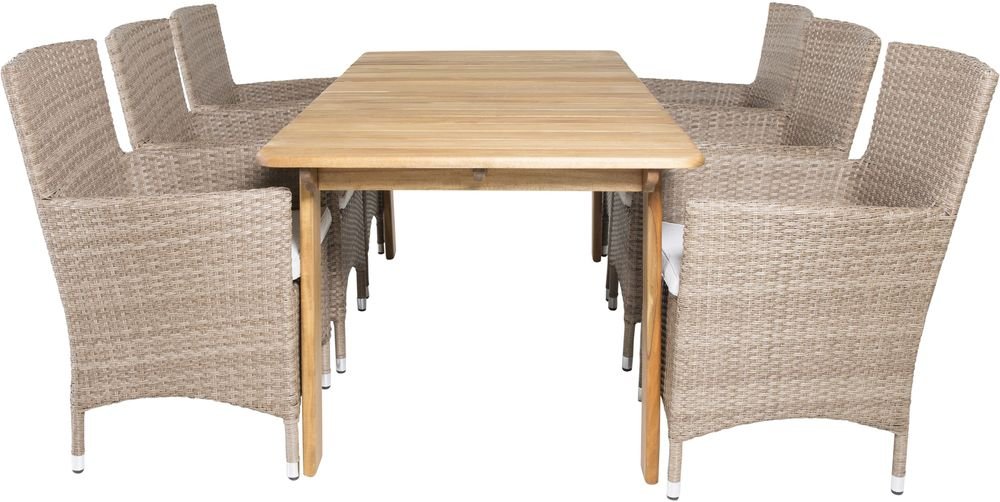 Matgrupp med ett bord och 6 stycken stolar. Stolarna är tillverkade av Konstrotting/Aluminium och bordet är tillverkat av Akacia. Dynor ingår.