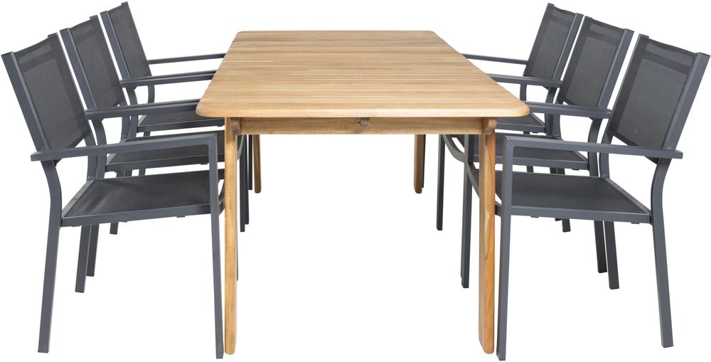 Matgrupp med ett bord och 6 stycken stolar. Stolarna är tillverkade av Aluminium/Textilene och bordet är tillverkat av Akacia. Stolarna är stapelbara.