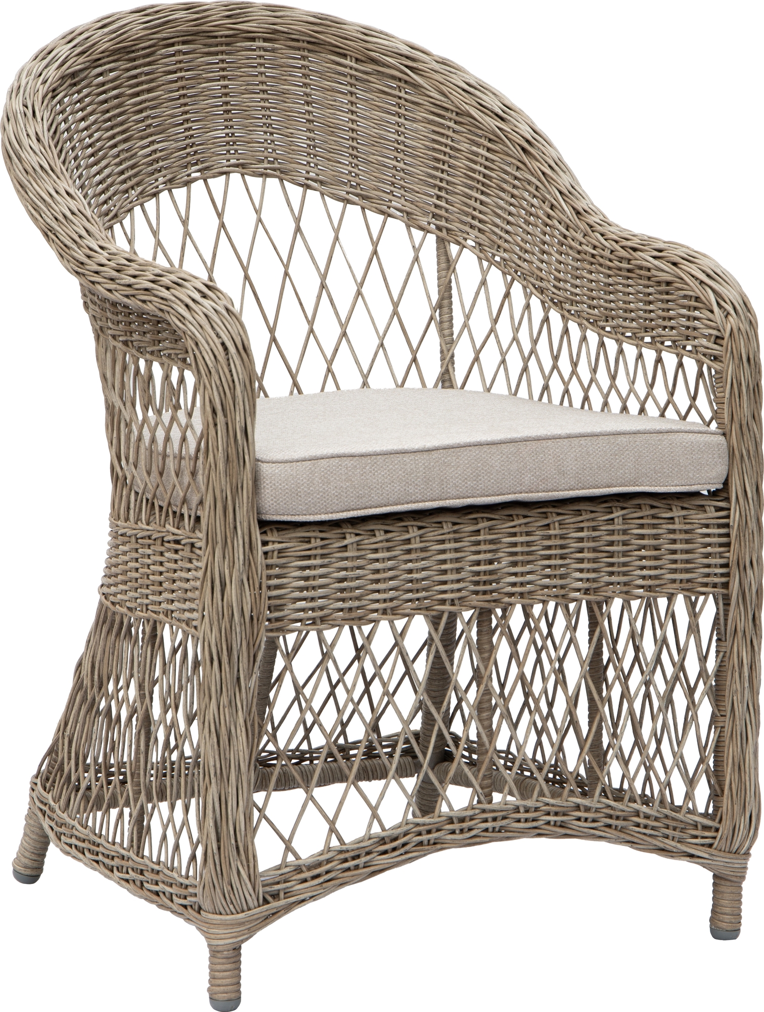 En bekväm utefåtölj i naturfrgad rund konstrrotting med stomme i aluminium. Passar både som stol till matplasten eller som en solitär fåtölj med ett sidobord.