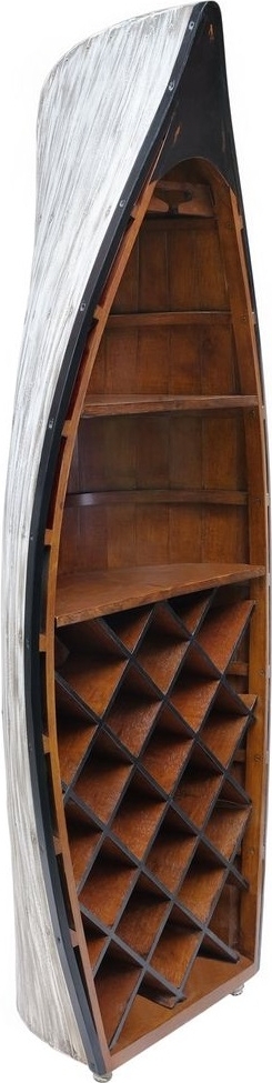 Vinställ i form av en vitmålad båt i massiv furu. Ett vinställ med ett rustikt utseende. Det finns både plats för vinflaskor och hängare för vinglas.