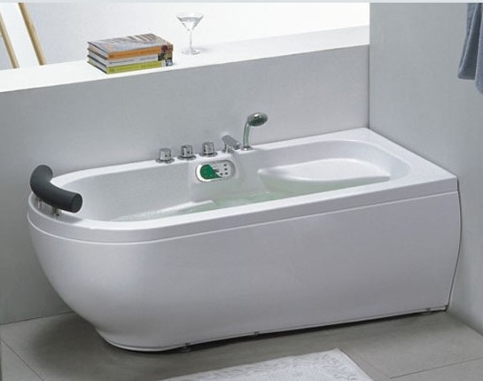 Komplett massagebadkar med blandare, tillverkat i tålig akryl. Materialet har fördelen att inte gulna och är enkelt att underhålla.