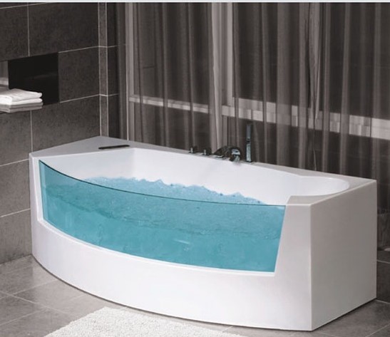 Komplett massagebadkar med blandare, tillverkat i tålig akryl. Materialet har fördelen att inte gulna och är enkelt att underhålla.