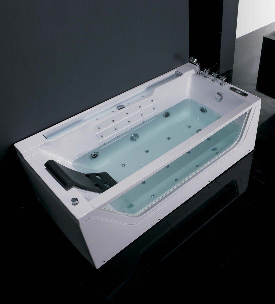 Komplett massagebadkar med blandare, tillverkat i tålig akryl. Materialet har fördelen att inte gulna och är enkelt att underhålla.