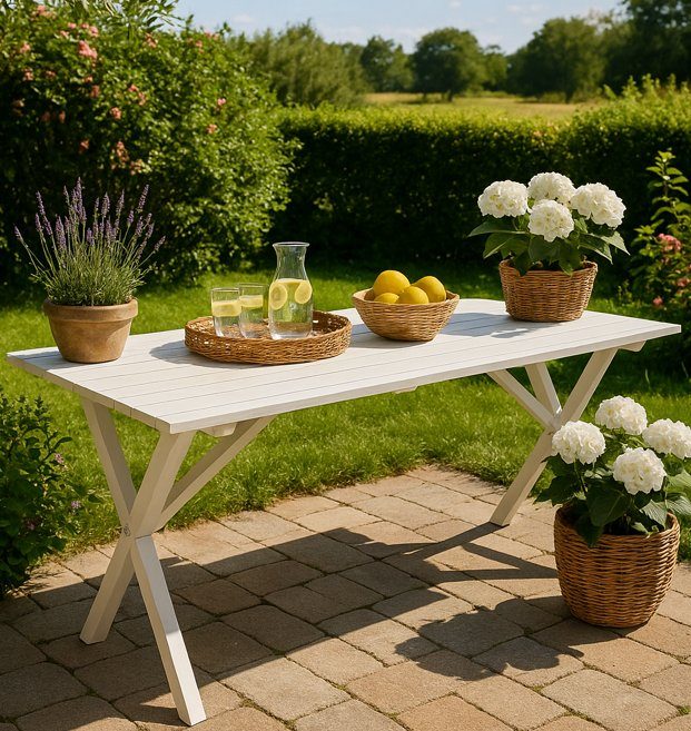 Det här robusta matbordet i vitmålad furu är perfekt för dig som vill samla familj och vänner på en rymlig uteplats. Bordet har en stilren design med dekorativa kryssben som ger både stabilitet och karaktär. Med sina generösa mått passar det utmärkt för större sällskap, samtidigt som den klassiska vita färgen ger en fräsch och tidlös känsla till din utemiljö.