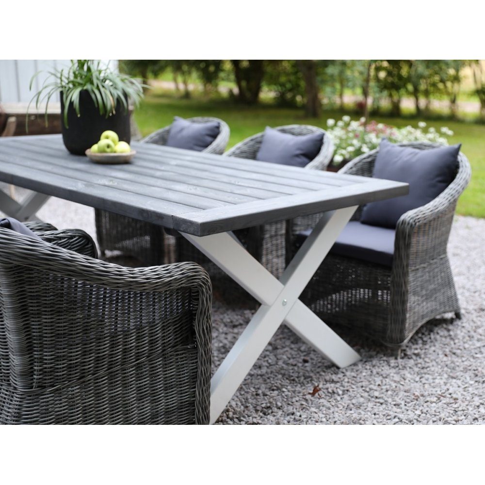 Bordet från Oxford-serien kombinerar hållbarhet och elegans med sin robusta konstruktion i vit och grå färg. Bordsskivan består av breda plankor som skapar ett rustikt och naturligt intryck medan de stabila kryssbenen tillför både stil och stabilitet. Designen på bordet gör det till ett perfekt val för större uteplatser eller terrasser, där det erbjuder en generös och inbjudande yta för middagar med vänner eller familj utomhus.