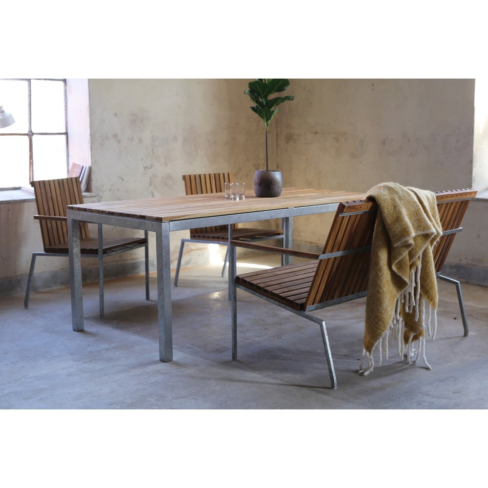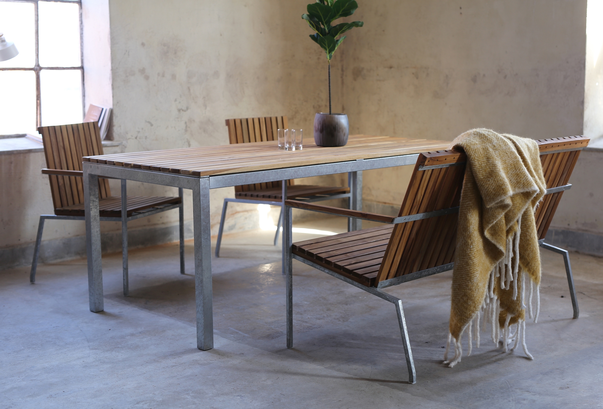Matgrupp Alva: Matbord med 2 st Alva stolar + 1 st Alva soffa - Teak / Galvaniserat stål