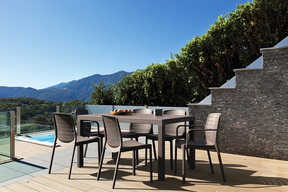 Matgrupp Cedargrain är en mycket snygg och stilren matgrupp i grått för uteplatsen, trädgården eller uterummet. Inkluderat är 6 stycken stolar och ett rejält bord med bordsskiva som är rutigt mönstrad med ram av träimitation. Möblerna är tillverkade i högkvalitativ plast som är UV-skyddad och väderbeständig. Dessutom är de lätta att rengöra och för övrigt underhållsfria. Bordet är försett med hål i mitten för parasoll (ej inkluderat) och justerbara ben för reglerbar höjd. De 6 stycken stolarna är stapelbara, vilket underlättar vid förvaring. Stolarna har skönt ryggstöd, antihalk gummi under stolsbenen och några enstaka hål i sitsen för vattenavrinning och luftning.