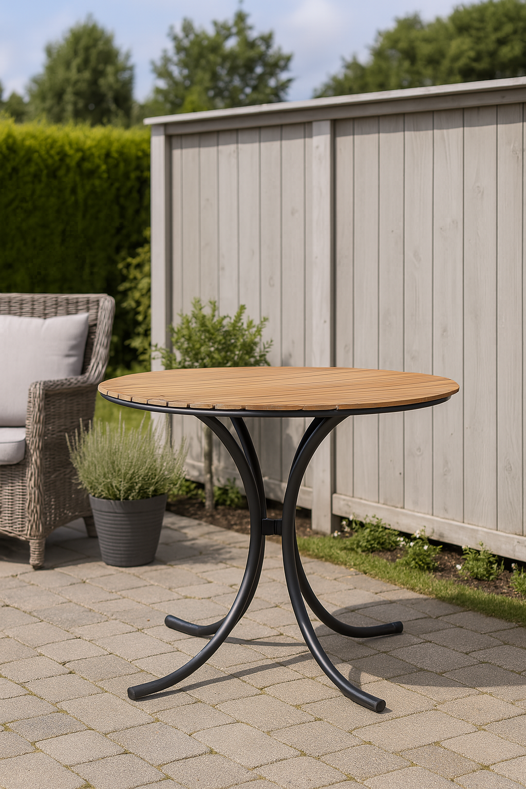 Det runda Holmsund-bordet har en bordsskiva i slitstarkt acaciaträ behandlat med teakolja, vilket framhäver träets naturliga ådring och ger en varm, exklusiv yta. Underredet i svartlackerad metall ger ett modernt uttryck och god stabilitet – perfekt för måltider på altanen, balkongen eller i trädgården. Den nätta designen gör det lätt att möblera även på mindre ytor.