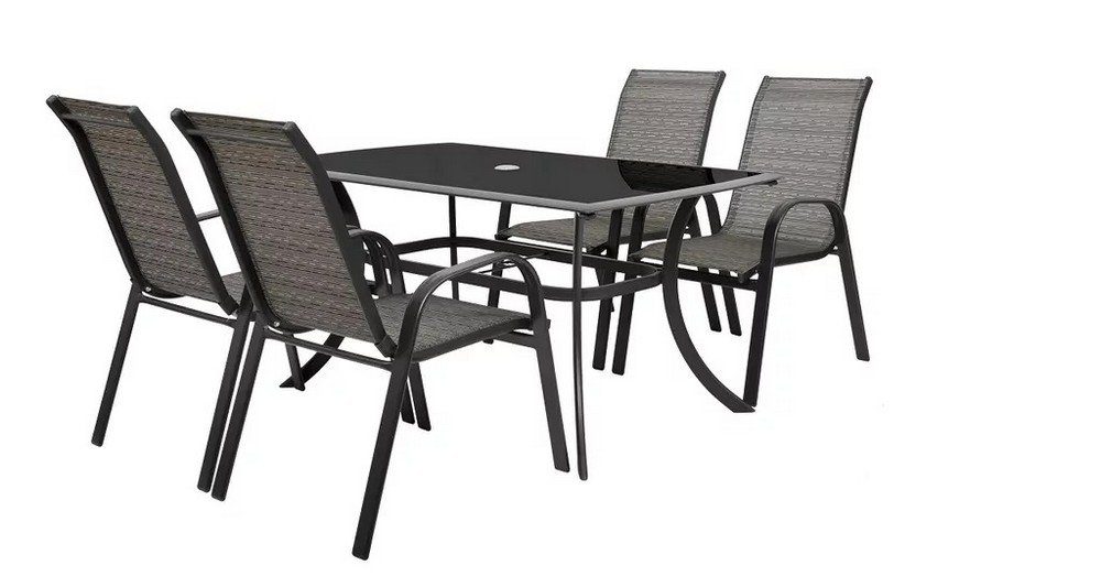 Trädgårdsmöbler i aluminiumprofil. Set om 6 stola (stapelbara) och ett bord (med svart glasskiva). Lämplig för skyddade trädgårdar, under altantak och liknande. Ej lämplig för våta platser.