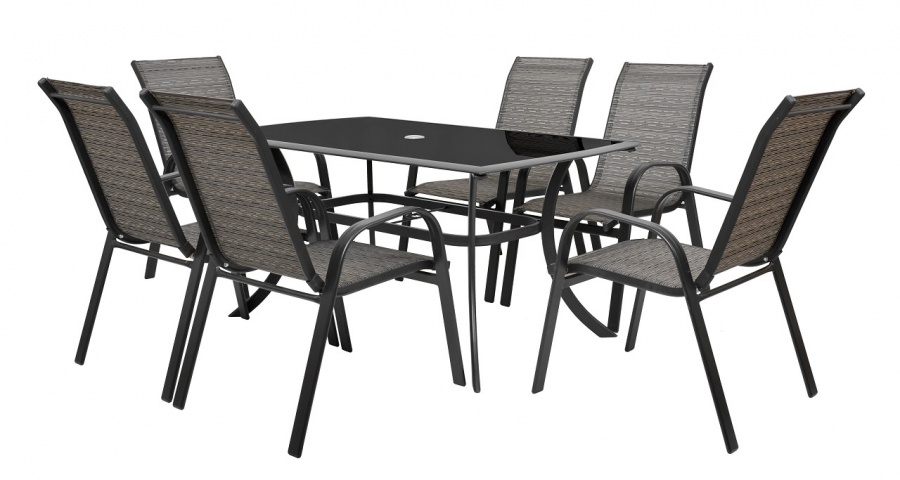 Trädgårdsmöbler i aluminiumprofil. Set om 6 stola (stapelbara) och ett bord (med svart glasskiva). Lämplig för skyddade trädgårdar, under altantak och liknande. Ej lämplig för våta platser.