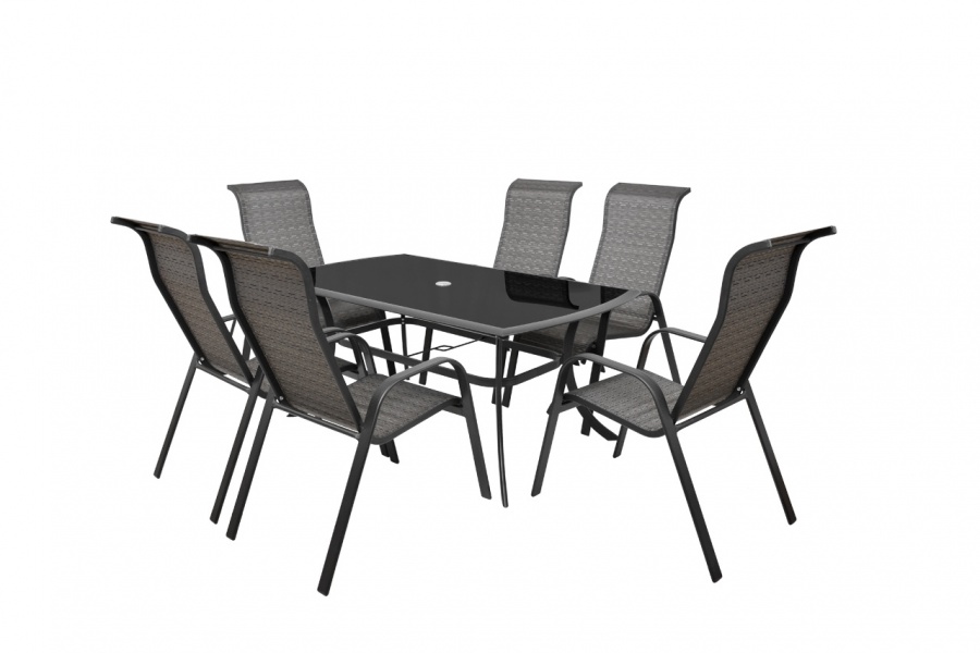 Set med bord (med svart glasskiva) och 6 stapelbara stolar i alu-profil. Passar till skyddade trädgårdsutrymmen.