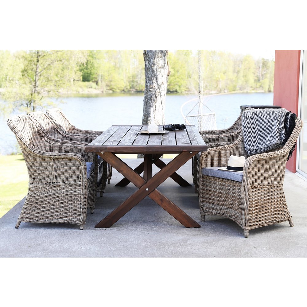 Matgrupp till utemöblemanget, bord i brunlaserad furu med kryssben samt 6 st Lotus matchande fåtöljer. En matgrupp i harmoni där möblerna går snyggt ihop och skapar en helhet som är svåröverträffad.