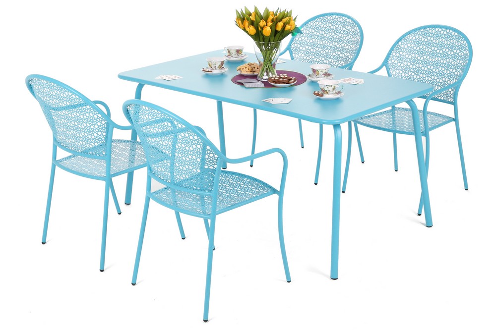 Vackert och iögonfallande möbelset med profiler och bordsskiva i metall. Matgruppen är målad i en semimatt pulverlack, vilket garanterar ett intressant utseende samtidigt som det skyddar mot rost. Matgruppen blir en intressant del i trädgårdsarrangement.