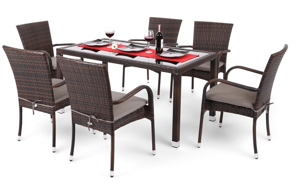 Matgrupp Mori är ett elegant set tillverkat i konstrotting. De pulverlackerade stålprofilerna ger möbelgruppen stabilitet och tålighet. Konstrottingen är extremt tålig och ihop med bordsskivan i härdat glas tål detta set alla utomhusförhållanden.Stolarna inkluderar sittdynor.