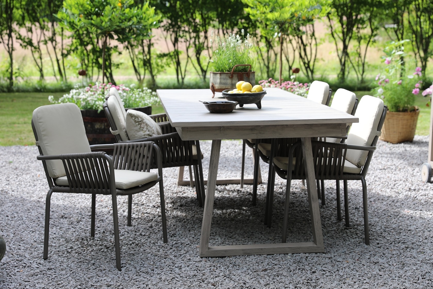 Stor matgrupp till uteplatsen, Saltö 240 cm långt bord i grålackad teak med 6 st matchande Lincoln stabelbara utestolar i grålackad aluminium med beige dynor. En matgrupp i harmoni där möblerna går snyggt ihop och skapar en helhet som är svåröverträffad. Passar lika bra i uterummet som på altanen.