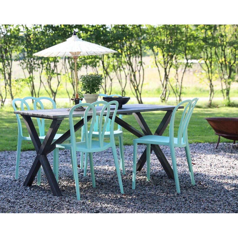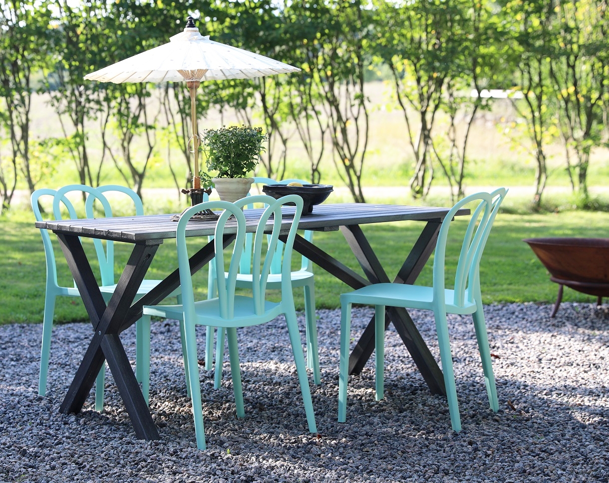 En nätt matgrupp till uteplatsen. Scottsdale matbord i grålaserad furu med 4 st stapelbara Bally stolar i mintgrön formgjuten plast. En matgrupp i harmoni där möblerna går snyggt ihop och skapar en helhet som är svåröverträffad. Passar lika bra i uterummet som på altanen.