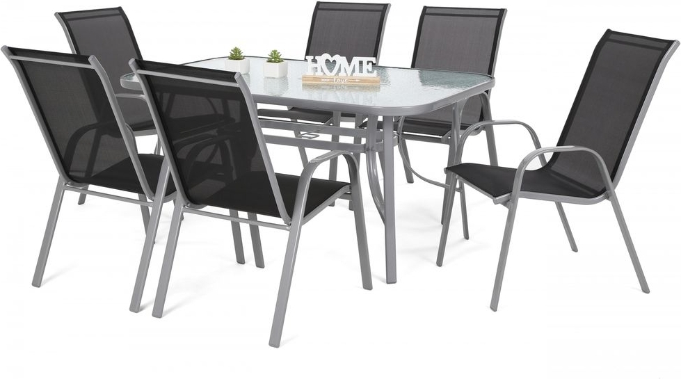 Utematgrupp med bord och sex stolar som är stapelbara. Tillverkat i pulverlackerat stål med ryggstöd & sits i textil. Bordsskivan är tillverkat av 5 mm härdat glas. Bordet har även hål för parasoll i mitten.