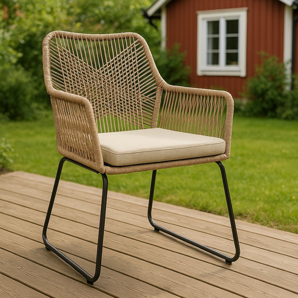 Vera är en elegant och bekväm karmstol som passar perfekt vid utematbordet. Den kombinerar en klassisk design med moderna material vilket gör den till en tidlös möbel till din uteplats. Den naturfärgade konstrottingen ger stolen ett varmt och inbjudande uttryck, medan den sandfärgade dynan ger extra komfort för långa middagar. Det svartlackade metallunderredet skapar en stabil grund och en snygg kontrast mot det ljusa sitsen.