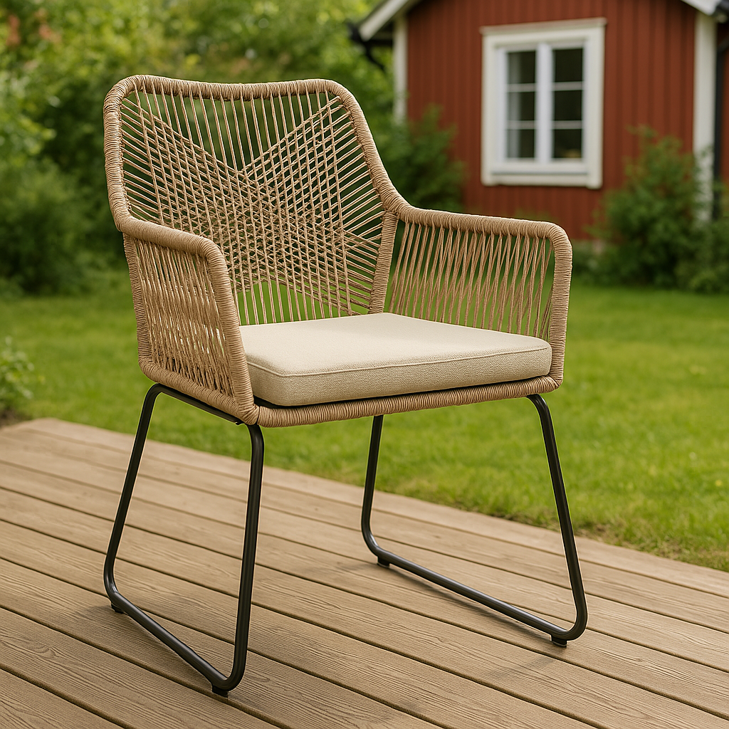 För att bevara stolens utseende och hållbarhet rekommenderas regelbunden rengöring med en lätt fuktad trasa. Dynan kan vid behov dammsugas eller torkas av med en mjuk duk. För extra skydd vid längre tids användning utomhus kan stolen placeras under tak eller förvaras inomhus.