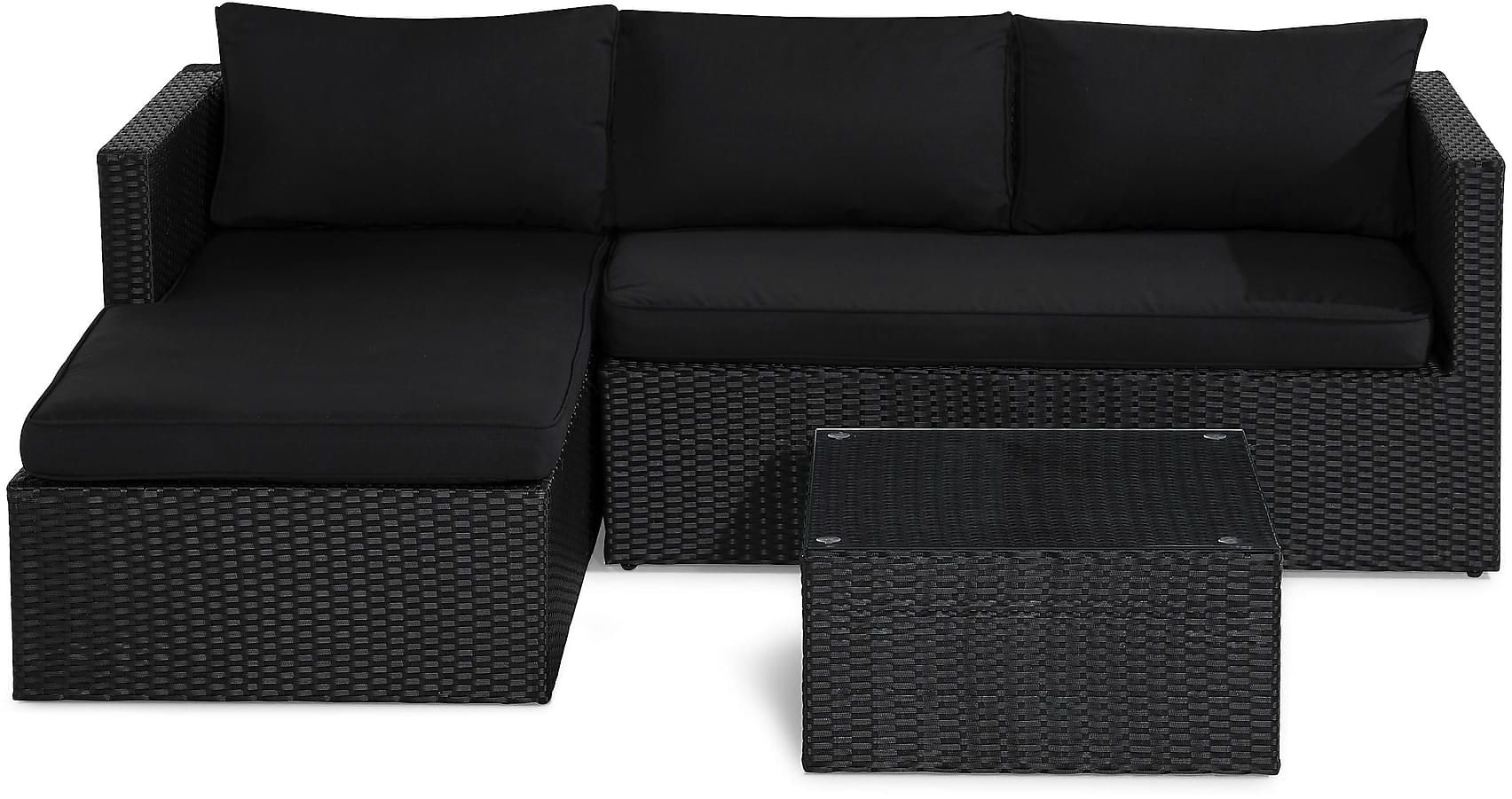 - Medföljande soffbord med glasbordsskiva och bekväma dynor