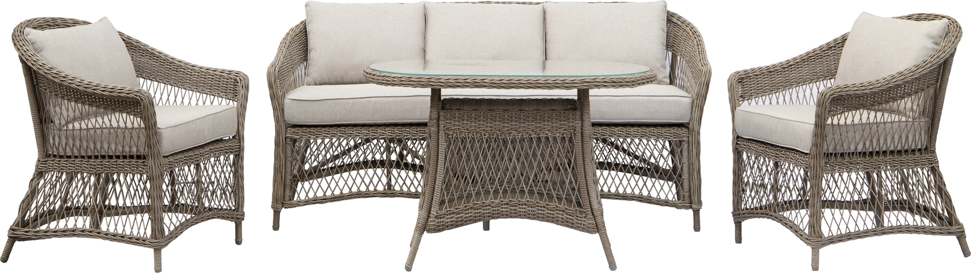 Menton soffgrupp i naturfärgad konstrotting ed dynor i beige tyg. Klassisk design som smälter in på uteplatsen eller i uterummet. 3-sits soffa med två fåtöljer och ett matchande soffbord.