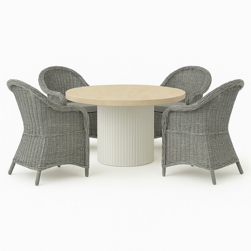 Merca matgrupp: Runt bord + 4 st grå Mercury fåtöljer grå konstrotting + Rengöringsspray för utemöbler