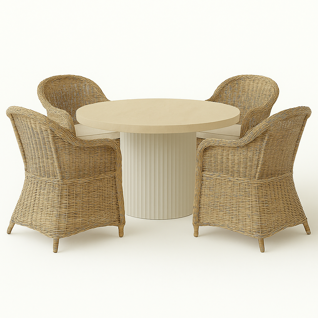 Merca matgrupp: Runt bord + 4 st Mercury fåtöljer naturfärgad konstrotting