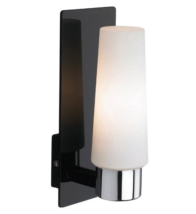 Stilren vägglampa, anpassad för badrummet. Väggplattan är tillverkad i svart metall, lamphållaren i krom och vit glaskupa. Avsedd för fast installation. 1x4W fast LED, 220 lumen. Energiklass A. Simpel montering av lampan i badrummet.