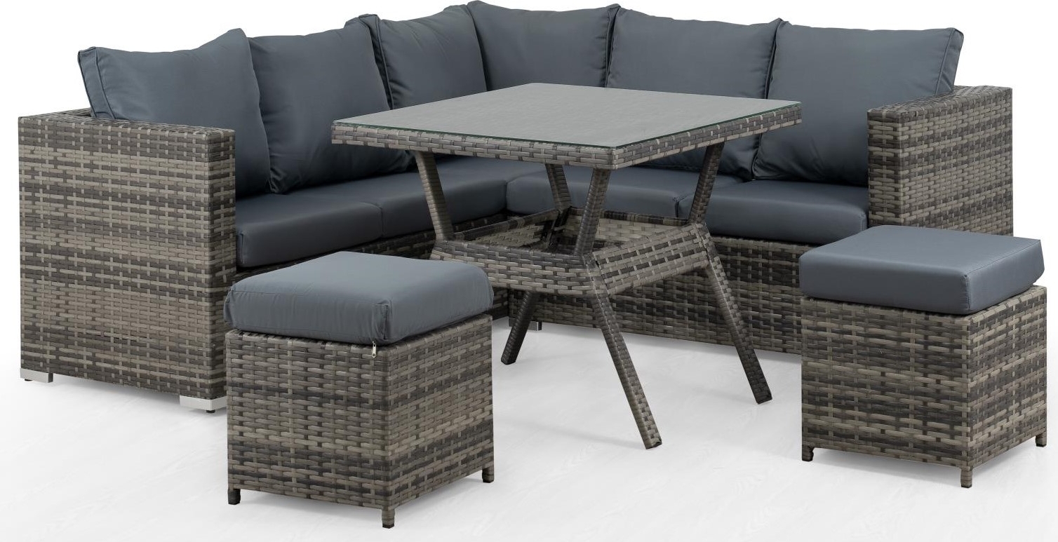 Trevlig liten utemöbelgrupp gjord av neutral gråmelerad konstrotting. Möbelgruppen består av bord, 3-sists soffa, soffhörna och 2 fotpallar. Gruppen kommer med tillhörande gråa dynor till soffa och pallar. Samt bordet har glasskiva för en enkel rengöring. Möbelgruppen har starkt skelett av stål.
