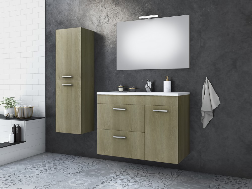 Aegean möbelpaket från Nordamist med ett ljusbrunt vägghängt tvättställsskåp & integrerat porslinstvättställ, spegel, sidoskåp och belysningspaket.