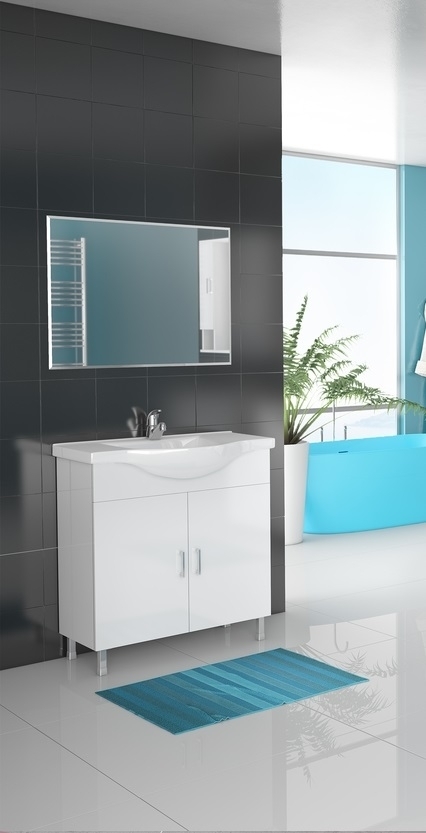 Alba möbelpaket från Nordamist med ett vitt golvstående tvättställskåp, tvättställ av porslin och en spegel.